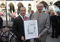 For a four day period around the event, in the famous Marienplatz city square, a large fog collector constructed by FogQuest attracted widespread attention. The Hundertwasser award is signed by Minister Schnappauf of the Bavarian Ministry of the Environment, as well as directors of WasserStiftung, and was presented to Dr. Robert Schemenauer from Canada and Mr. Pablo Osses from Chile. In the evening, a fund raising dinner for 150 sponsors and supporters of WasserStiftung was arranged.