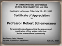 The Scientific Committee of the 4th International Conference on Fog, Fog Collection and Dew awarded Dr. Robert Schemenauer a certificate of appreciation for the work he has done over the years to promote the science and applications of fog collection. The award was presented BY Professor Simon Berkowicz, of the Hebrew University of Jerusalem, at the conference banquet in La Serena, Chile, on 26 July 2007. Also receiving awards were FogQuest member, and Director of the Atacama Desert Center in Chile, Professor Pilar Cereceda, and Professor Adrie Jacobs of Wageningen Agricultural University in the Netherlands.